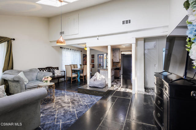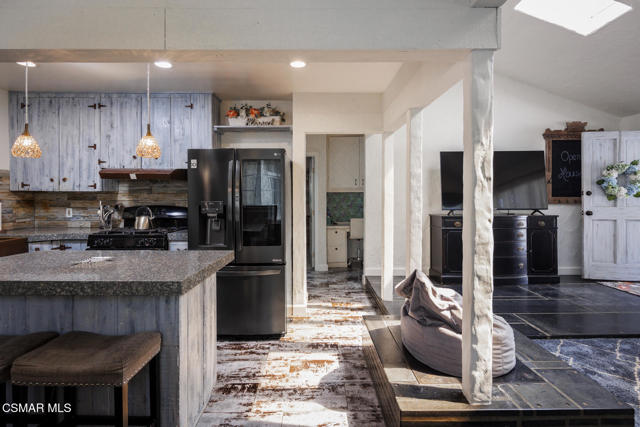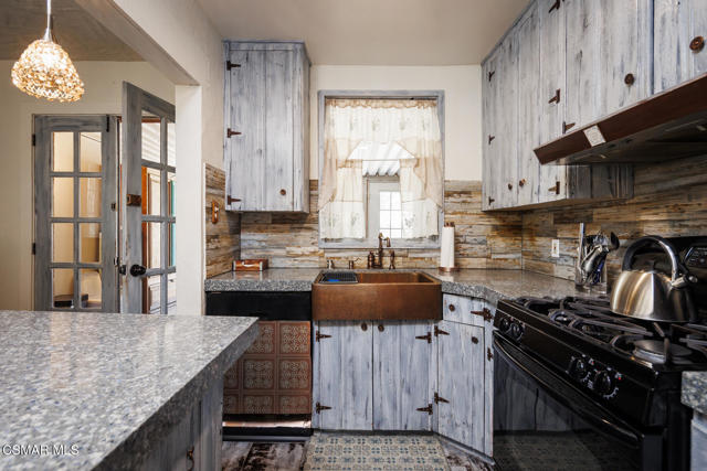This cozy Nantucket-inspired bungalow is now ready for new owners! Uniquely styled, this charming home features a lovely kitchen/nook/great room with an island bar. The cabinets have a whimsical seaside feel with a blue wash, rustic exposed hinges and pulls while the dark stone floors inset with real copper pennies and the distressed beachwood-looking kitchen floors hint at vintage luxury. The upgraded granite plays on the color while the hand-hammered copper sink and dishwasher panel exude a seaside, almost nautical-like quality. The vaulted ceilings and skylights bring the outside in, while the lighting complements and accentuates all these elements. You can almost taste the salt in the air. Contrasting the casual beach-like feel inside, the near downtown and pedestrian location offers an urban feel replete with the sounds of the city. It's a combination that almost sounds like the ocean in the distance. The floorplan is extremely versatile, offering up to 3 bedrooms or 2 and a den and 2 full baths. But that's not all! The primary with its separate entrance affords the new owner the opportunity to create a separate apartment for a multi-generational solution or extra income as a rental. The covered and enclosed patio adds additional usable space and leads to the sizable back yard down to the creek. With a large driveway and covered two-car carport, this home awaits someone special who wants a single-family residence instead of a condo or townhome. No shared walls and no HOA either, make this Conejo Valley Living at its easiest.Interested in this Listing?