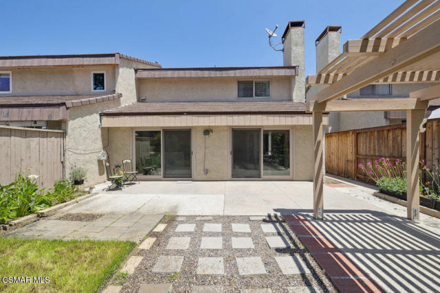 Townhome that feels like a single family. Step into wood beamed ceiling living room with fireplace. Neutral colored kitchen with eating nook. Both with newer sliding doors to a spacious yard with grass area and trellis seating area. Half bath downstairs with direct access two car garage. Fresh paint, newer flooring and newer carpet leading to upstairs spacious bedrooms. Bath has two access sinks for the bedrooms with shared tub between. Good size bedrooms with newer windows. Guest parking and cul-de-sac location. Community offers pool, spa, tennis/pickle ball courts.Interested in this Listing?