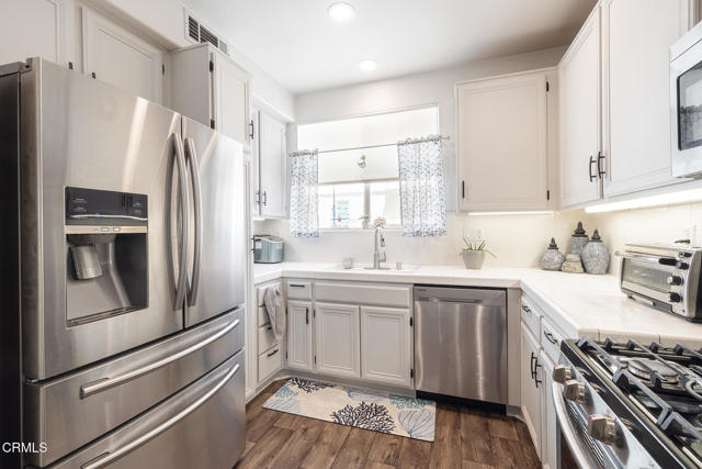 Elegant End-Unit Townhome in Downtown Ventura with attached 2.5 garage built in 2002.Beautifully upgraded end-unit townhome just minutes from the beach, shopping, dining, and theaters. This light-filled home features an open-concept layout with a bright kitchen, newer appliances, counter bar, cozy living room with fireplace, and dining area that opens to a breezy balcony overlooking the community courtyard.Upstairs, has two primary bedrooms with their own full bathrooms. The first spacious primary suite includes a walk-in closet with custom built-ins with dual vanities, an oversized shower with seat. The secondary bedroom offers its own ensuite with its own full tub/shower and mirrored closet doors.Additional highlights include high ceilings, a dedicated laundry area on the same level as the bedrooms, modern fireplace in the beautiful living room area with the beach living feel. A front patio shaded by mature trees to enjoy that coastal breeze, and a versatile bonus space with a built-in Murphy bed--ideal for a home office or gym. The attached 2.5-car tandem garage features natural light, extra storage, and rare direct access into the home.Enjoy secure, low-maintenance coastal living just 10 minutes from the sand, shops, and restaurants of vibrant downtown Ventura. Most of the furniture included in the sale of the home. Low $400/mo HOA includes insurance, water, trash, and greenbelt maintenance.Interested in this Listing?